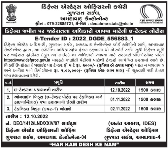 Defense Estates Officer, Gujarat Circle, Opposite Cantonment Board Office, Ahmedabad Government Procurement Portal for awarding rights of advertisement hoardings (total 01 sites) on defense land from Dafnala to Airport Circle under the jurisdiction of this office by Ahmedabad Cantonment