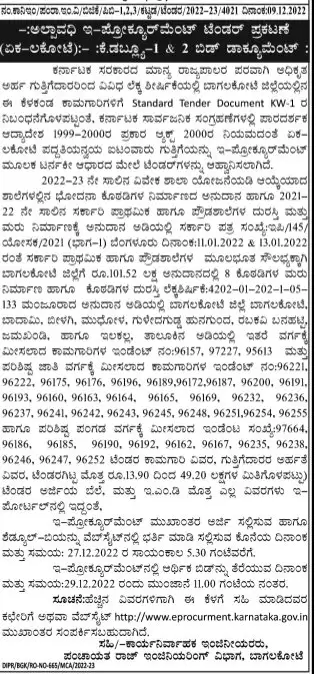 Tender for AX 2000, single-envelope system, item-wise contract through e-procurement on turnkey basis. Tenders are invited. Government Letter No: EP/145 cies/2021 (-1) pair and reconstruction of government primary and high schools for the year 2021-22. & 13.01.2022 for the basic facilities of Government Primary and High Schools Bagalkote District