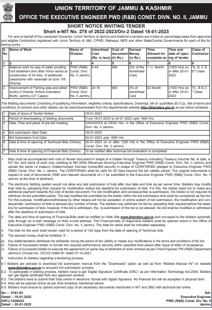 Tender for Balance work by way of water proofing roof treatment and other minor works at construction of 04 Nos. of additional classrooms with verandah at Govt. HS. Ghorda