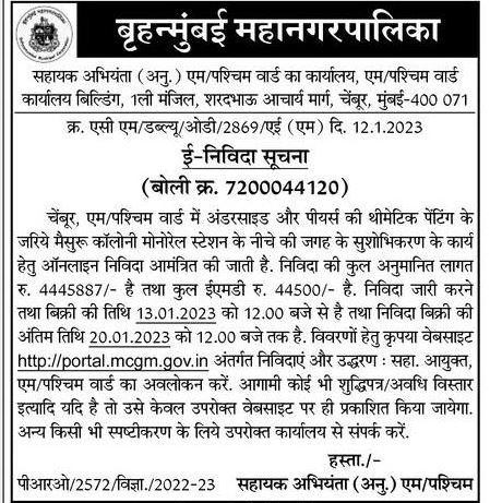 Tender for Beautification works of Mysuru Colony Monorail Station by thematic painting of underside and piers at Chembur, M/West Ward