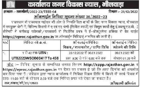 Tender for behalf of the Governor of Rajasthan, City Development Trust, Bhilwara for the following works, A and AA category (E.W.S.C. for loose power and electrical works) in various departments in appropriate category.