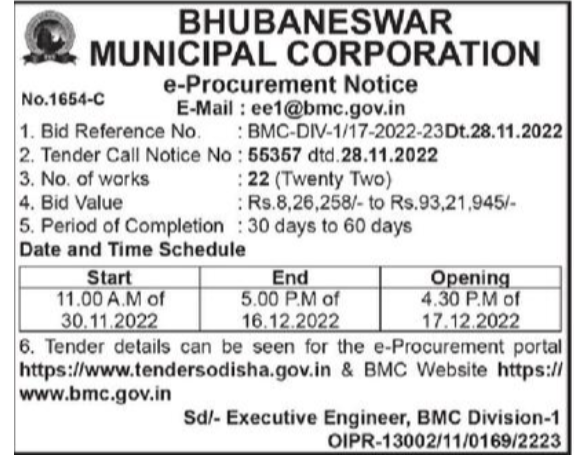Tender for BHUBANESWAR MUNICIPAL CORPORATION BMC-DIV-1/17-2022-23Dt.28.11.2022
