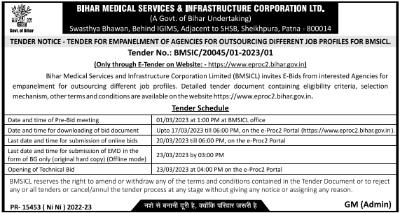 Tender for Bihar Medical Services and Infrastructure Corporation Limited (BMSICL) invites E-Bids from interested Agencies for empanelment for outsourcing different job profiles. Detailed tender document containing eligibility criteria, selection mechanism, other terms and conditions are available on the website https://www.eproc2.bihar.gov.in.