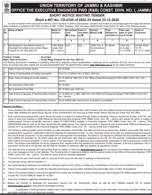 Tender for Blacktopping in the different wards of Municipal Committee Amia (Under Mega Projects for the Year 2022-23)