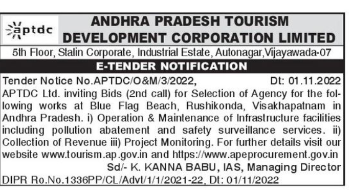 Tender for Blue Flag Beach, Rushikonda, Visakhapatnam in Andhra Pradesh. i) Operation & Maintenance of Infrastructure facilities including pollution abatement and safety surveillance services. ii) Collection of Revenue iii) Project Monitoring.