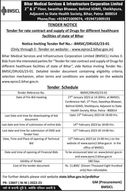 Tender for BMSICL Bihar Medical Services & Infrastructure Corporation Limited contract and supply of Drugs for different healthcare facilities of state of Bihar BMSIC/DRUGS/23-01