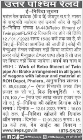 Tender for Board Railway Manager (K&V) Jaipur Work of Retro fitment of Twin pipe Air Brake arrangement in all types of wagons with labor and material at ROH Depot, Phulera.,