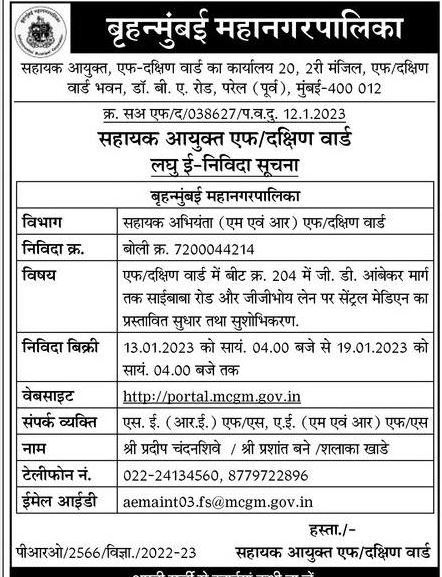 Tender for Brihanmumbai Municipal Corporation department outh Ward in Beat no. In 204 G. D. Central median on Saibaba Road and Jeejeebhoy Lane up to Ambekar Marg. Proposed improvements and beautifications.
