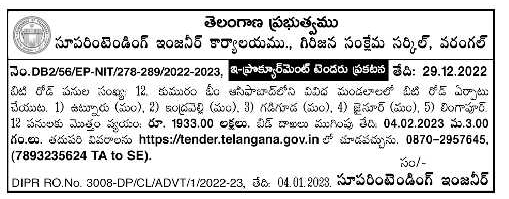 Tender for BT Road Works: 12, Construction of BT Road in various Mandals of Kumaram Bhim Asifabad. 1) Utnur (M), 2) Indravelli (M), 3) Gadiguda (M), 4) Jainur (M), 5) Lingapur
