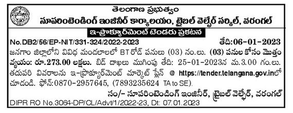 Tender for BT Road works in various Mandals of Janagam District (03) Nos. (03) Total Expenditure for Works