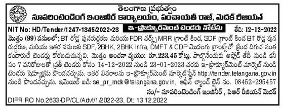 Tender for BT Roads Rehabilitation and FDR Works under MRR Grant, BT Roads Rehabilitation under SDF Grant, and other works under SDF, 2BHK, 2BHK Infra, DMFT & GDP etc. Grants.