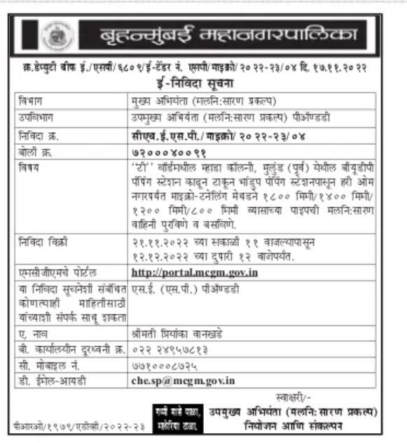 Tender For BUDP at Mhada Colony, Mulund (East) in “T” Ward | Hari Om from Bhandup pumping station by removing the pumping station | Supply and installation of 1800 mm/ 1400 mm/ 1200 mm/ 800 mm diameter pipe sewerage by micro tunneling method to the city.
