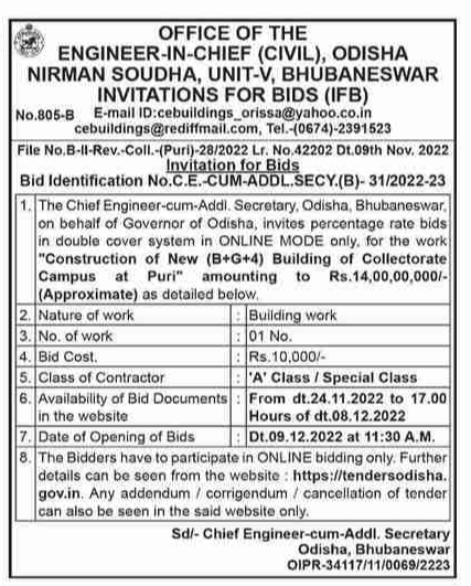 “Construction of New (B+G+4) Building of Collectorate Campus at Puri” amounting to Rs.14,00,00,000/- (Approximate) as detailed below.