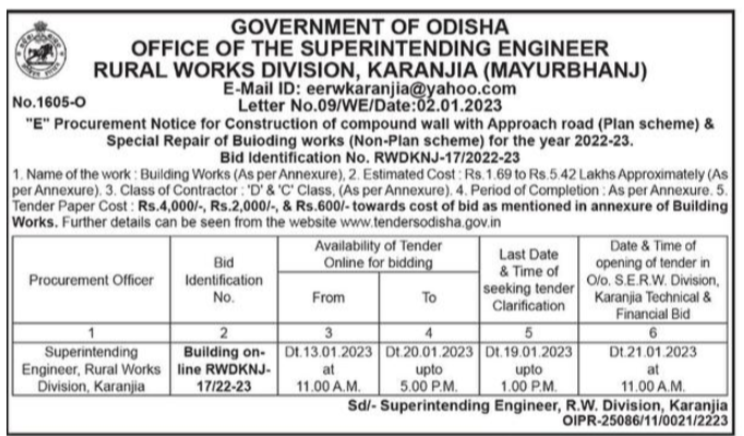 Tender for Building Works Construction of compound wall with Approach road (Plan scheme) & Special Repair of Buioding works (Non-Plan scheme) for the year 2022-23.