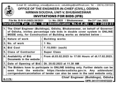 Tender for Building works in OFFICE OF THE ENGINEER-IN-CHIEF (CIVIL), ODISHA NIRMAN SOUDHA, UNIT-V, BHUBANESWAR