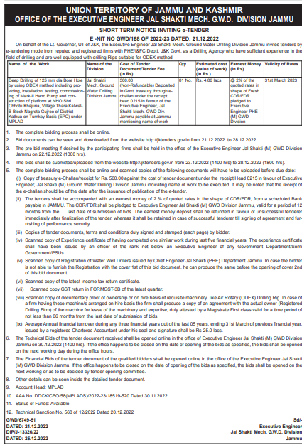 Tender for by using ODEX method including pro-Mech. Ground viding, installation, eating, commission-Water Drilling (Non-Refundable) Deposited in Govt treasury through e Division Jammu