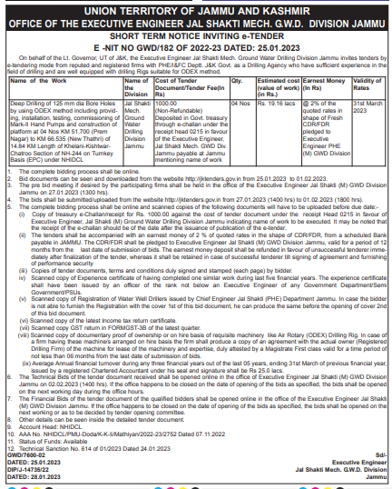 Tender for by using ODEX method including provid-Mech. ing, installation, testing, commissioning of Mark-Hand Pumps and construction of platform at 04 Nos KM 51.700 (Prem Nagar) to KM 66.535 (New Thathri) of 14.84 KM Length of Khelani-Kishtwar-Jammu