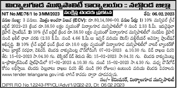 Tender for Bypass plantation on both sides. 0 to 2.33 km in Miryalaguda Municipality at a cost of Rs.38.50 lakhs under 10% Municipal Green Budget 2022-23.