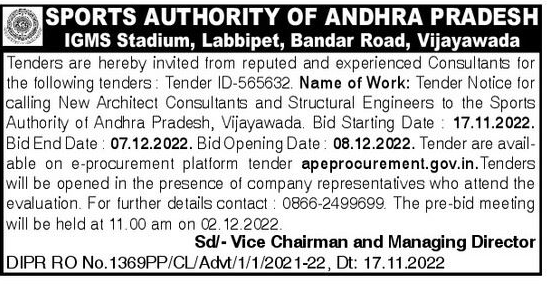 calling New Architect Consultants and Structural Engineers to the Sports Authority of Andhra Pradesh, Vijayawada.