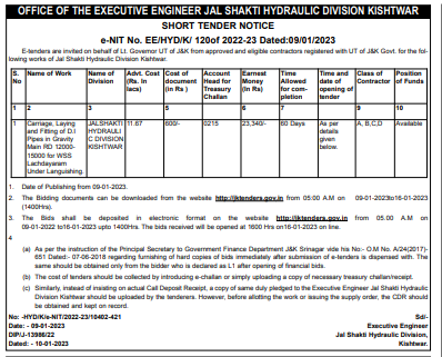 Tender for Carriage, Laying and Fing of D Pipes in Gravity Main RD 12000 15000 for WSS Lachdayanam Under Languishing JALSHAKTI HYDRAULI C DIVISION