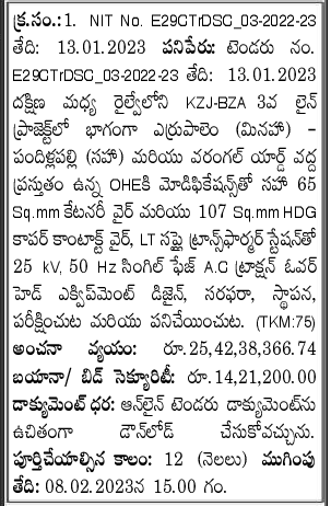 Tender for catenary wire and 107 Sq.mm catenary wire including modifications to existing CHE at Errupalem (Excl.) – Pandullapally (Incl.) and Warangal Yard as part of KZJ-BZA 3rd Line Project of South Central Railway. mm HDG copper contact wire, with LT supply transformer station | Design, Supply, Installation, Testing and Commissioning of 25kV, 50 Hz Single Phase A.C Traction Overhead Equipment.