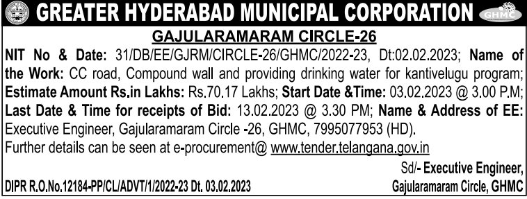 Tender for CC road, Compound wall and providing drinking water for kantivelugu program;