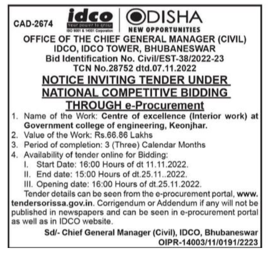 Tender for Centre of excellence (Interior work) at Government college of engineering, Keonjhar.