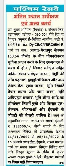 Tender for Chaupadarization between Anand-Geratpur section (50.54 km). To facilitate final location survey including drone/lidar survey in respect of FLS, soil investigation, collection of hydrological and other field data, preparation and submission of land records, land acquisition proposal, demarcation of land boundary etc. Includes preparation of GAD of bridges and detailed
