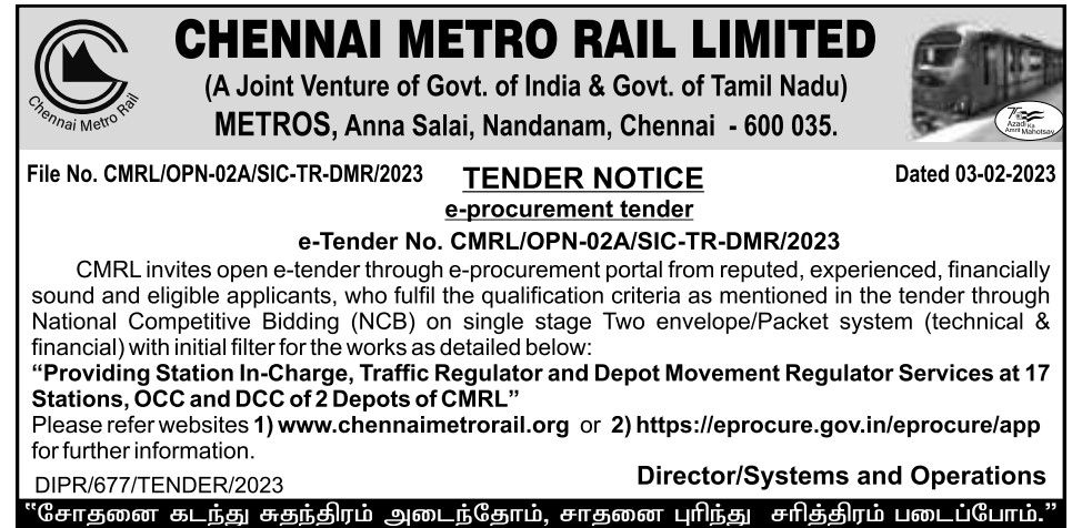 CMRL invites open e-tender through e-procurement portal from reputed, experienced, financially
