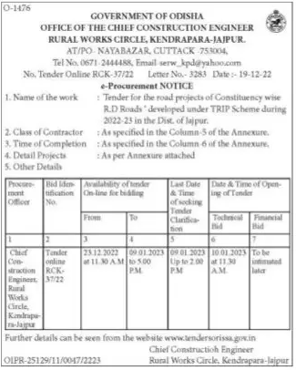 Tender for Chief Con- Rural Works Engineer, Circle, Kendrapa- ra-Jaipur