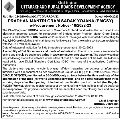 The Chief Engineer, URRDA on behalf of Governor of Uttarakhand invites the item rate bids in