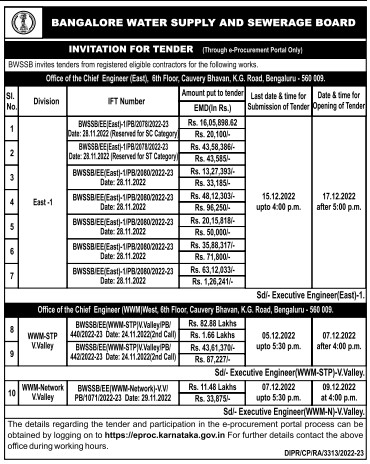 Tender for Chief Engineer (WWM)West, 6th Flo BWSSB/EE(WWM-STP/V.Valley/PB/ 440/2022-23 Date: 24.11.2022(2nd Call)