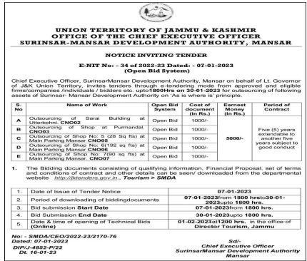 Tender for Chief Executive Officer, SurinsarMansar Development Authority. Mansar on behalf of Lt. Governor of J&K Union Territory, invites tenders through e-tendering mode from approved and eligible firms/companies /individuals/bidders etc