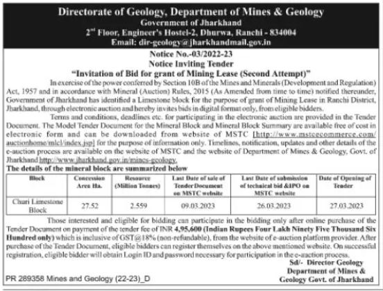 In exercise of the power conferred by Section 10B of the Mines and Minerals (Development and Regulation) Act, 1957 and in accordance with Mineral (Auction) Rules, 2015 (As Amended from time to time) notified thereunder. Government of Jharkhand has identified a Limestone block for the purpose of grant of Mining Lease in Ranchi District, Jharkhand, through electronic auction and hereby invites bids in digital format only, from eligible bidders.