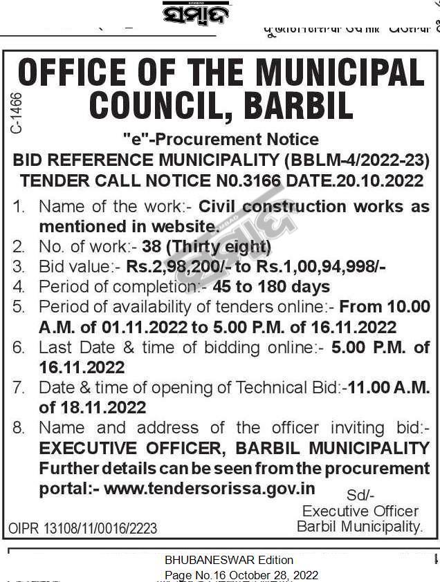 Civil construction works as mentioned in website. www.tendersorissa.gov.in