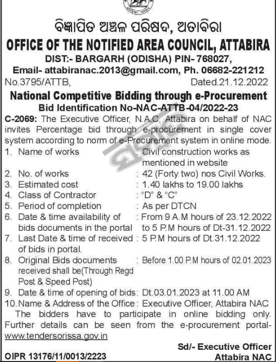 Tender for Civil construction works OFFICE OF THE NOTIFIED AREA COUNCIL, ATTABIRA