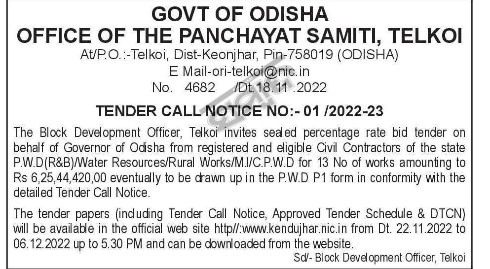 Tender for Civil Contractors of the state P.W.D(R&B)/Water Resources/Rural Works/M.I/C.P.W.D for 13 No of works amounting to Rs 6,25,44,420,00 eventually to be drawn up in the P.W.D P1 form in conformity with the detailed Tender Call Notice.