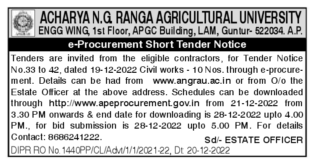 Tender for Civil works – 10 Nos. in ACHARYA N.G. RANGA AGRICULTURAL UNIVERSITY