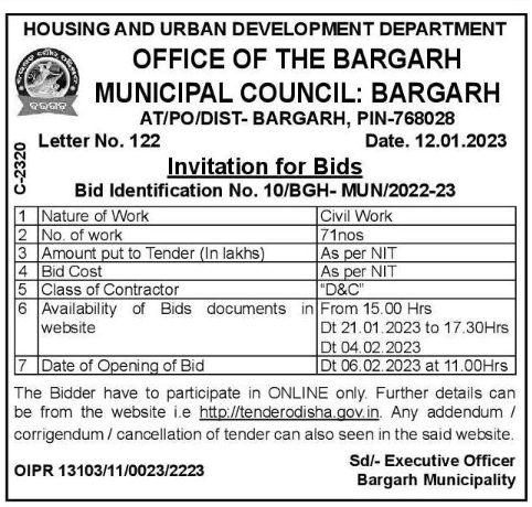 civil works at HOUSING AND URBAN DEVELOPMENT DEPARTMENT Homeland OFFICE OF THE BARGARH MUNICIPAL COUNCIL: BARGARH