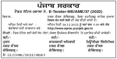 Tender for Civil Works by Municipal Council Gobindgarh, District Fatehgarh Sahib