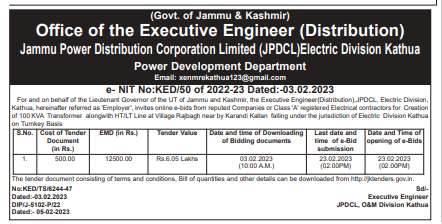 Tender for Class ‘A’ registered Electrical contractors for Creation of 100 KVA Transformer alongwith HT/LT Line at Village Rajbagh near by Karandi Kallan falling under the jurisdiction of Electric Division Kathua