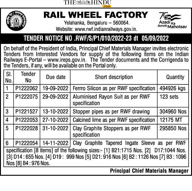 Tender for Clay Graphite Stoppers as per RWF specification in RAIL WHEEL FACTORY