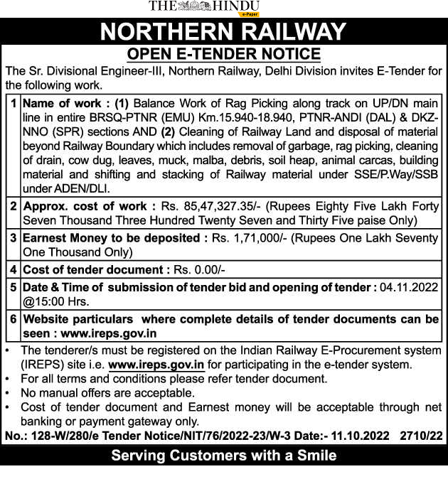 Balance Work of Rag Picking along track on UP/DN main line in entire BRSQ-PTNR (EMU) Km.15.940-18.940, PTNR-ANDI (DAL) & DKZ NNO (SPR) sections AND (2) Cleaning of Railway Land and disposal of material beyond Railway Boundary which includes removal of garbage, rag picking, cleaning of drain, cow dug, leaves, muck, malba, debris, soil heap, animal carcas, building material and shifting and stacking of Railway material under SSE/P.Way/SSB under ADEN/DLI.