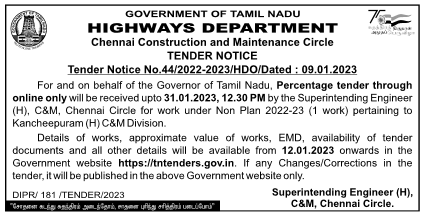 Superintending Engineer (H), C&M, Chennai Circle for work under Non Plan 2022-23 (1 work) pertaining to Kancheepuram (H) C&M Division.