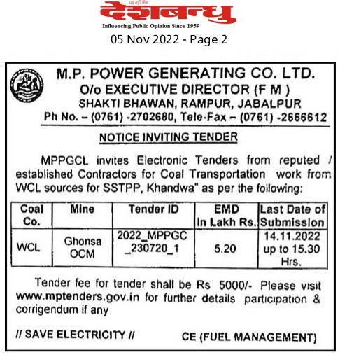 MPPGCL invites Electronic Tenders from reputed established Contractors for Coal Transportation work from WCL sources for SSTPP, Khandwa”
