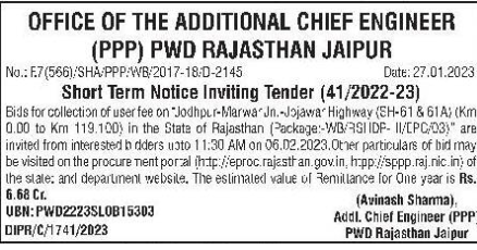 Tender for collection of user fee on “Jodhpur-Marwar Jn.-Jojawar Highway (SH-61 & 61A; (Km 0.00 to Km 119.100) in the State of Rajasthan (Package:-WBARSI IDF- II/CPC/03)”