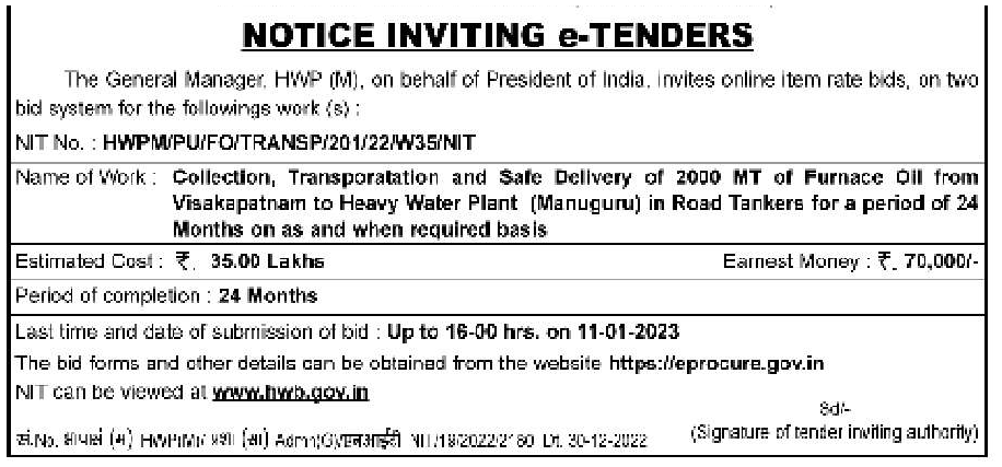 Tender for Collection, Transporatation and Safe Delivery of 2000 MT of Furnace Oil from Visakapatnam to Heavy Water Plant (Manuguru) in Road Tankers for a period of 24 Months on as and when required basis