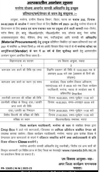 Tender for Commissioner, MNREGA, Rural Development Department, Bihar, Patna, for the implementation of the MNREGA scheme for the fiscal year 2023-24 for Nawada district, the material