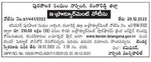 Tender for Commissioner Municipal Corporation of Works Narsinghi, Rangareddy District