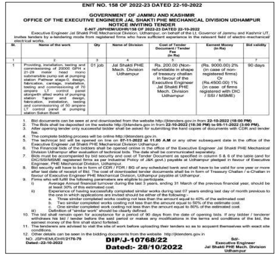 Tender for commissioning of 20000 GPH x 21-29 head mono submersible pump set at pumping station Pathwar stage-0 design fabrication, carriage,